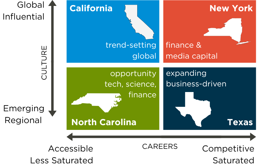 Each of these states offers distinct cultures and career landscapes. In larger, more established markets, long-standing industries are often saturated—meaning that while major companies are present, competition for entry is significantly higher. By contrast, “emerging” markets are those that have seen meaningful growth and new opportunity over the past 20 years.