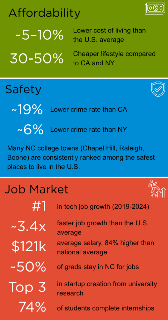 North Carolina offers a more balanced pace of life, with lower pressure and greater flexibility, allowing students to pursue opportunities while maintaining a comfortable and manageable lifestyle.